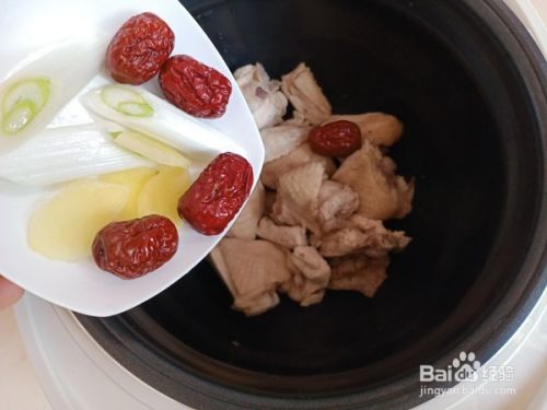 然后将焯过水的鸡块放入电饭煲内胆中,加入葱姜和红枣。