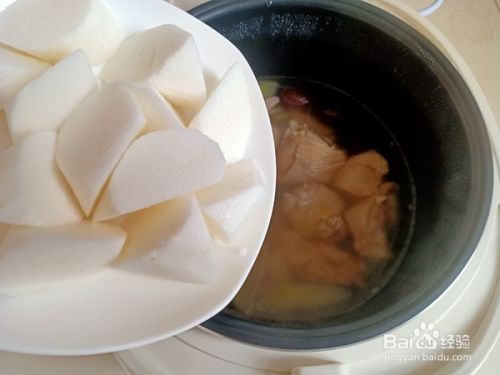 煲汤一个小时后,加入山药块继续煲。