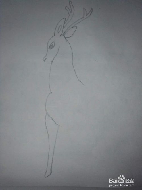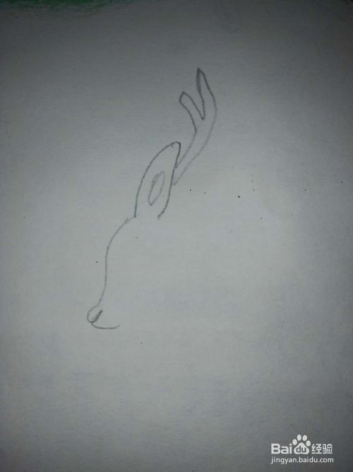 2接下来,我们这这根线条上面画出耳朵,耳朵的形状就是一个尖尖的椭圆形,接着画出鹿角。然后来画线条下边的鼻子。