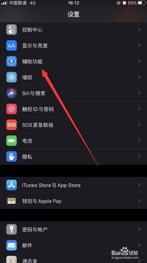 首先,进入到手机设置后,点击界面中的“辅助功能”一栏