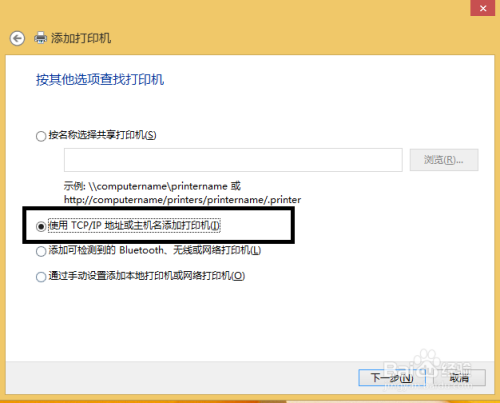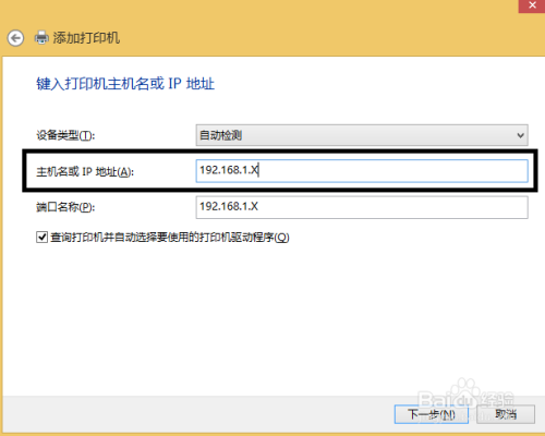 5.在“主机名或IP地址中”输入打印机获取到的私有IP地址,例如:192.168.1.X,点击下一步.