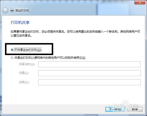 10.跳转到打印机共享界面,默认选择不共享这台计算机。