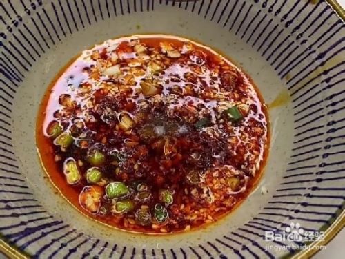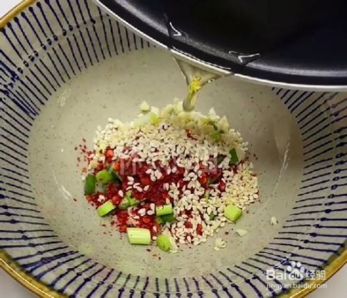 准备一个碗,碗中加蒜末,葱花,姜末,辣椒粉,白芝麻,淋上热油;