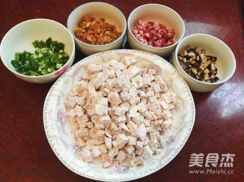 2芋头切粒 腊肠切丁 香菇切丁 虾米切碎 香葱切碎