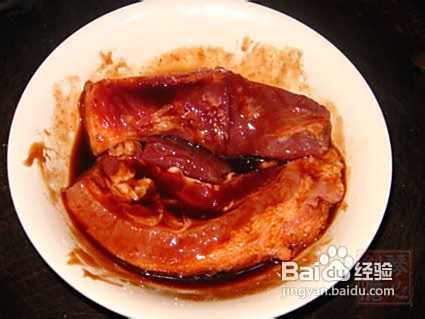 用叉烧酱两汤匙,生抽1汤匙,蜂蜜1汤匙做成调料,把肉涂抹均匀,然后一起放入冰箱腌制一晚。