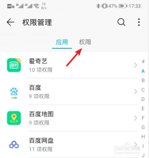 进入权限管理界面,默认显示的是应用权限,点击上方的权限分类。