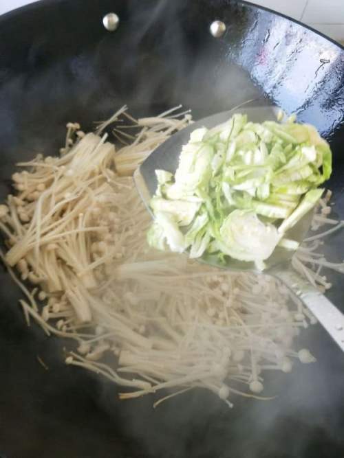 再加抱子甘蓝,等金针菇炒倒后