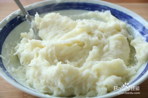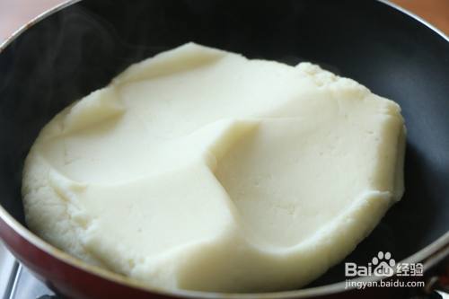 4、不粘锅里加入1块黄油,黄油融化之后,倒入山药泥,小火慢慢翻炒,炒至山药泥不沾锅铲,能抱团就可以;