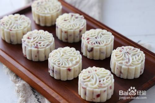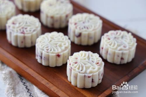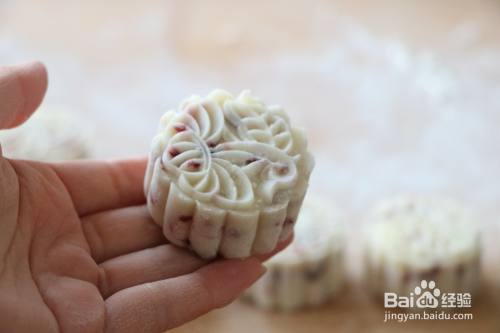 7、表面均匀沾上一层糯米粉,再用50克的月饼模具刻出花纹,这样我们的蔓越莓山药糕就做好了。