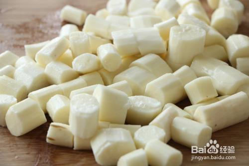 1、准备2根铁棍山药,洗干净之后,戴上手套先去皮,然后切成小块,装在碗中,隔水上锅蒸熟;