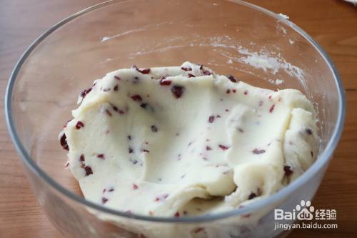 5、取出来放在碗中稍微凉下,再加入一把切碎的蔓越莓干,搅拌混合拌均匀;