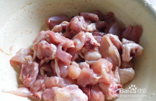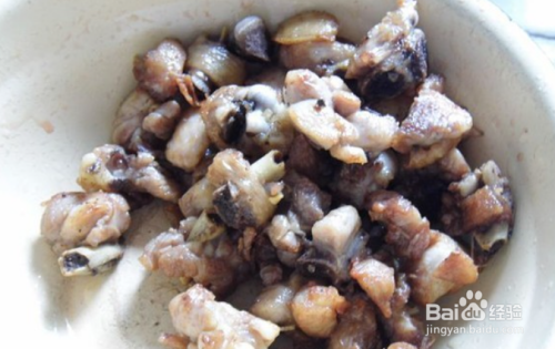 热锅油8成热放入腌制好的鸡腿肉,炸至外表变干成深黄色后捞起沥油待用
