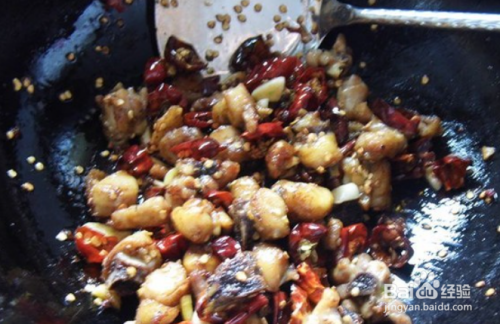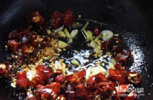 加入干辣椒和花椒,翻炒至气味开始呛鼻,油变黄色
