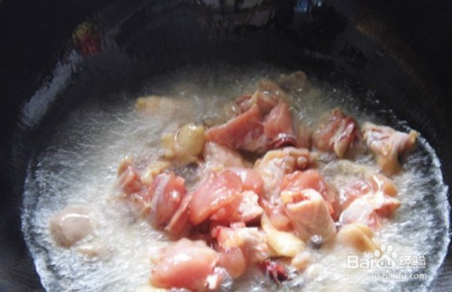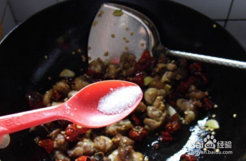 接着倒入炸好的鸡块炒匀,调入白糖炒匀