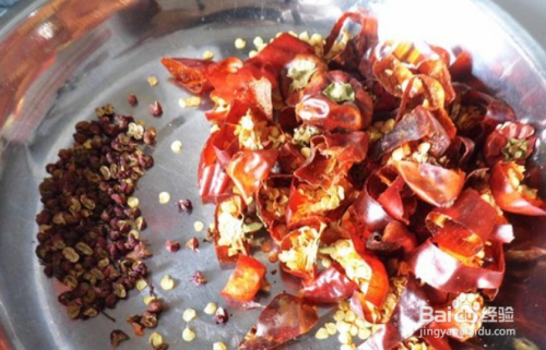 干红辣椒洗净用剪刀剪成段,花椒适量备好