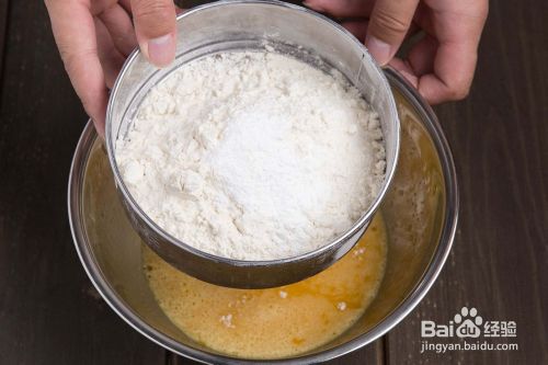 筛入低筋面粉和泡打粉,搅拌至无颗粒。