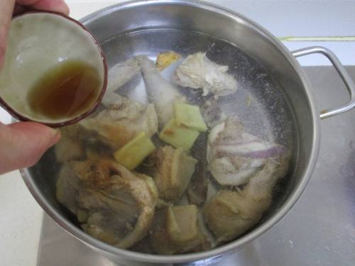6另起锅注入热水,先把焯水好的鸡块下入,再把料酒,生姜片下入