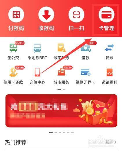 接着,进入云闪付首页,在上方的导航中选择“卡管理”,点击进入。如图: