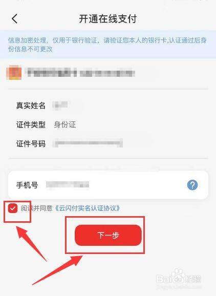接着,进入在线开通支付界面,在界面中确认相关信息,无误后,勾选协议,完成后点击“下一步”。如图: