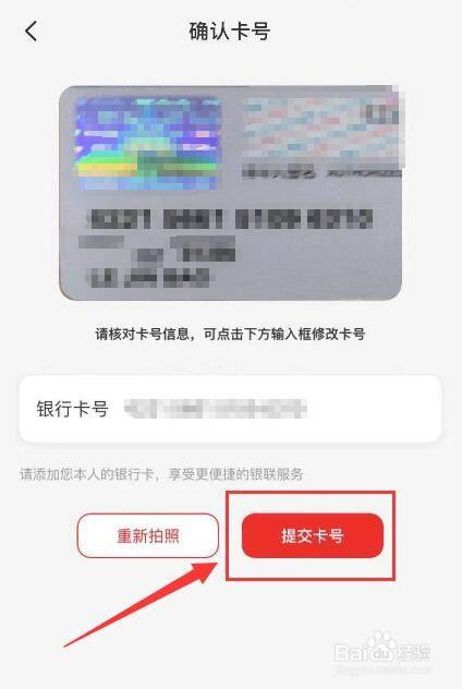 如果使用拍照自动读取卡号,进入确认卡号,确认无误后点击下方的“提交卡号”(如果需要重拍点击重新拍照即可)。如图: