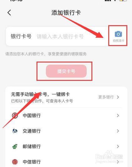 接着,进入添加银卡界面,在界面中输入银行卡卡号,或者拍银行卡自动读取卡号,完成后点击“提交卡号”。如图: