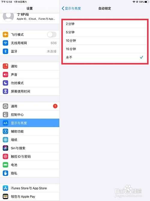 ipad息屏设置可以打开设置,在设置界面中点击显示与亮度,在显示与亮度界面中点击自动锁定,在弹出的页面中即可选择设置息屏时间。
