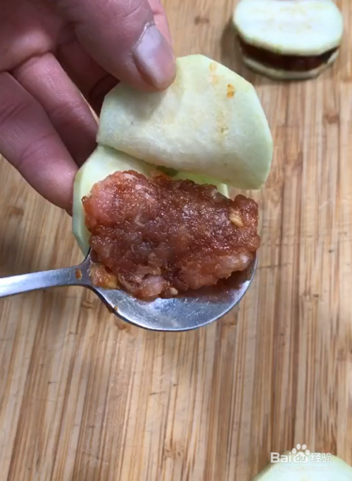 茄子夹上调好的肉馅,如图所示。