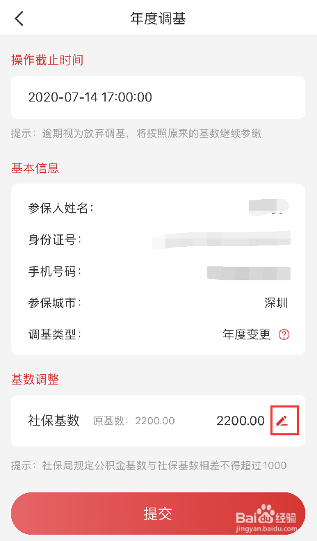 第四步:核对参保人信息,包括【姓名】【身份证】【手机号】【参保城市】,然后点击右下角【编辑】符号,左边显示的数字是当前的参保基数
