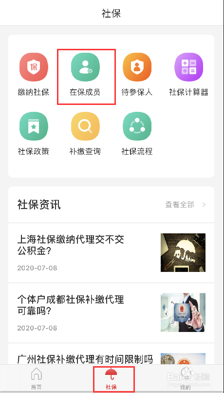 第一步:打开易社保APP,点击下方导航【社保】,然后点击页面上方【在保成员】