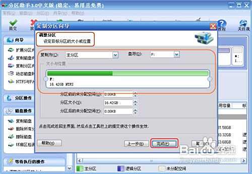 选择需要复制的分区后,接下来我们将选择目标空间,接下来你将进入“调整分区”窗口,这时候你可以选择和调整目标空间的位置和大小等,也可以采用默认的。调整好目标空间以后点击“完成”按钮