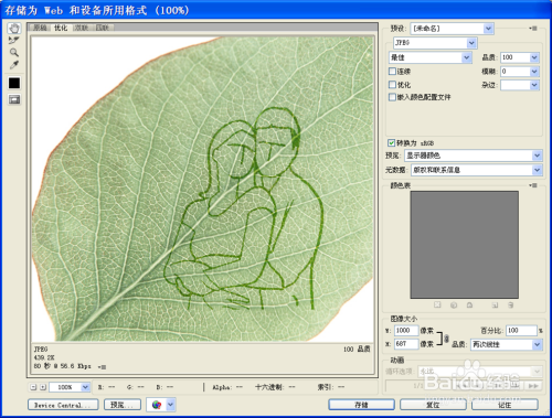 执行文件-存储为web和设备所用格式命令,将文件保存为JPEG格式即可、