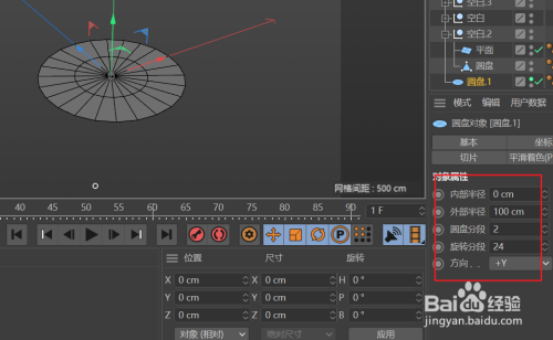 创建一个圆盘,旋转分段为24,方向为+Y;其它参数默认即可。后面会对圆盘进行修改的。