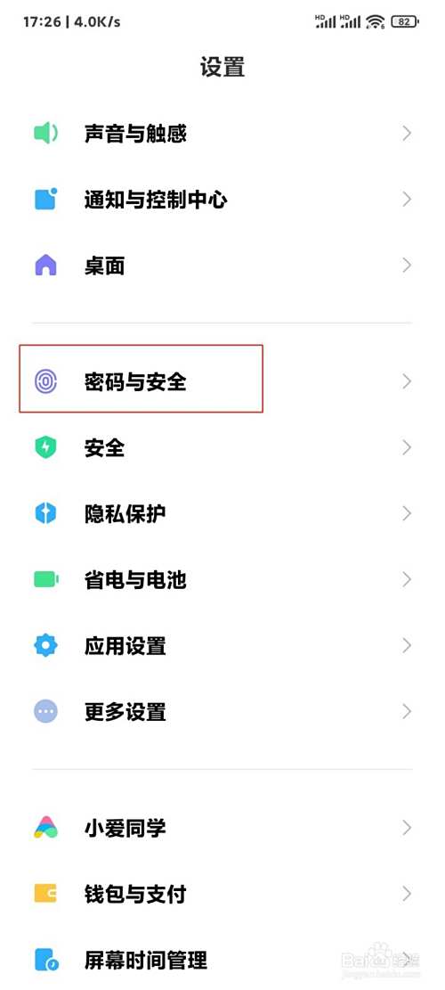 进入设置页后,向下滑动,找到“密码与安全”点击进入。
