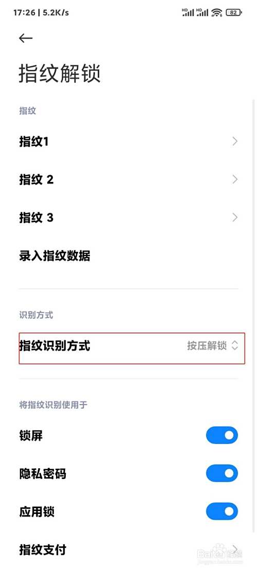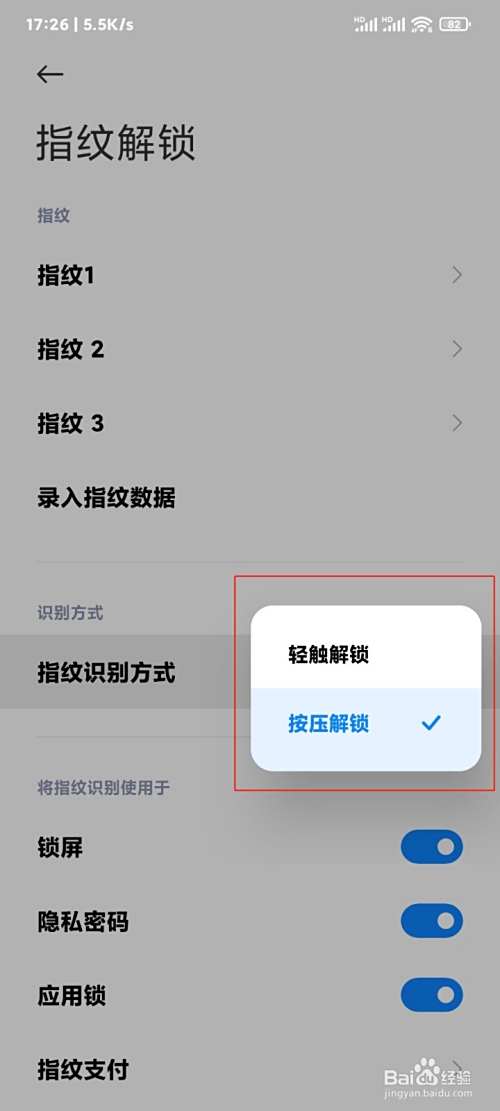 选择“按压解锁”后退出设置,即可设置成按压解锁的方式了。