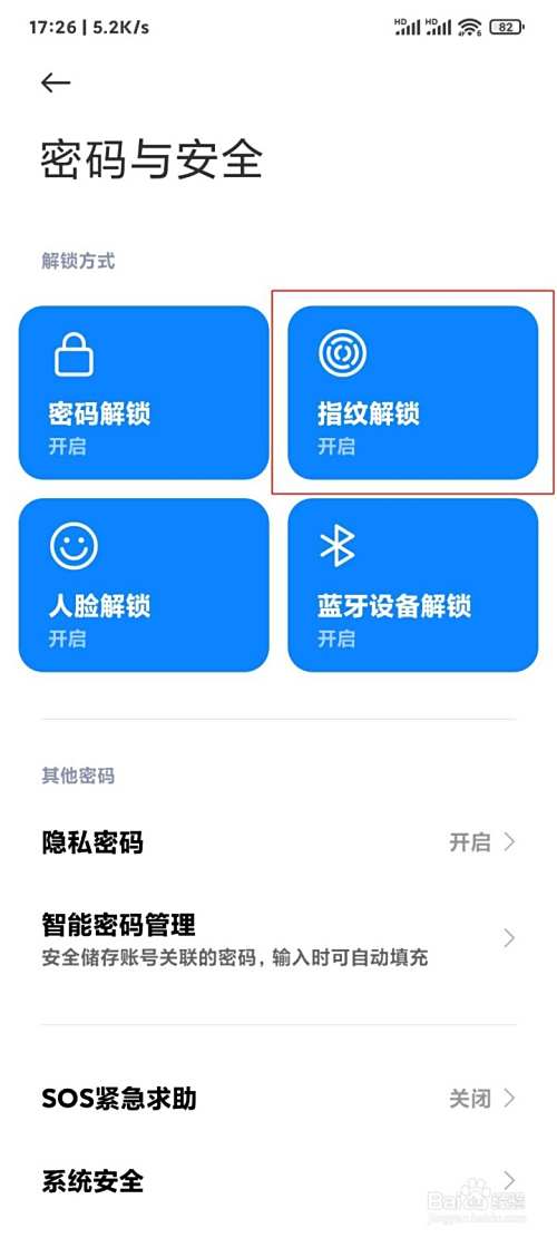 进入页面后,点击“指纹解锁”进入指纹相关设置项。