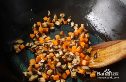锅中热油,放入姜末和香菇丁略炒再加入胡萝卜丁,调入酱油和蚝油炒匀。
