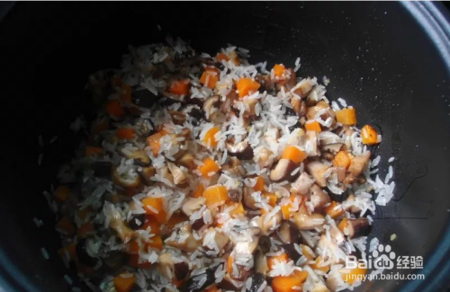 大米淘洗放入电饭煲,倒入香菇胡萝卜丁拌匀。