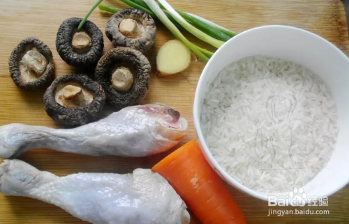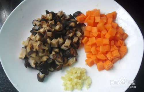 香菇泡发后洗净切小丁;胡萝卜去皮切小丁;姜切末。