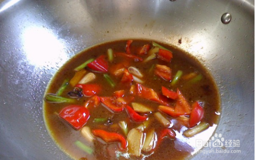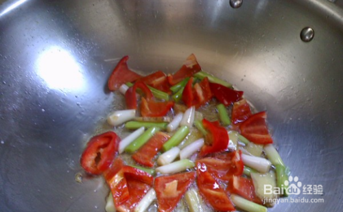 起锅热油,放入红椒、蒜、生姜炒香