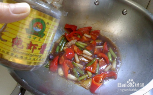 加入虾酱、生抽、食盐、白糖、料酒炒匀