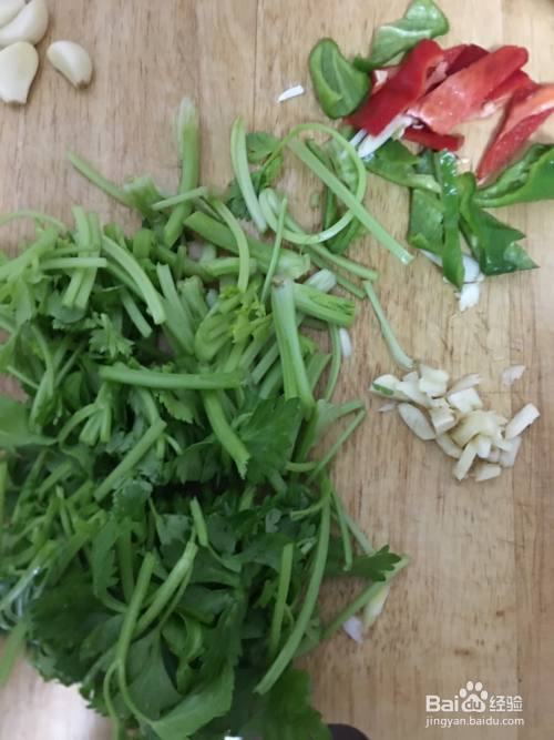 香芹切段、大蒜切碎、青红椒切块,豆干切薄片备用