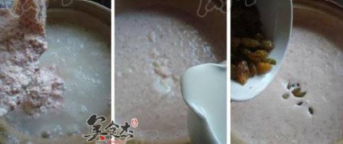 4倒入牛奶,搅拌均匀,再煮开即可,最后撒入洗净的葡萄干