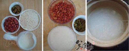 糯米浸泡1小时后,加水煮成粥,约20分钟花生事先浸泡2小时后,倒入搅拌机,加一些水打成花生糊将花生糊倒入煮好的糯米粥中倒入牛奶,搅拌均匀,再煮开即可,最后撒入洗净的葡萄干无需放糖,便有淡淡的甜香
