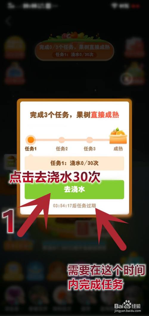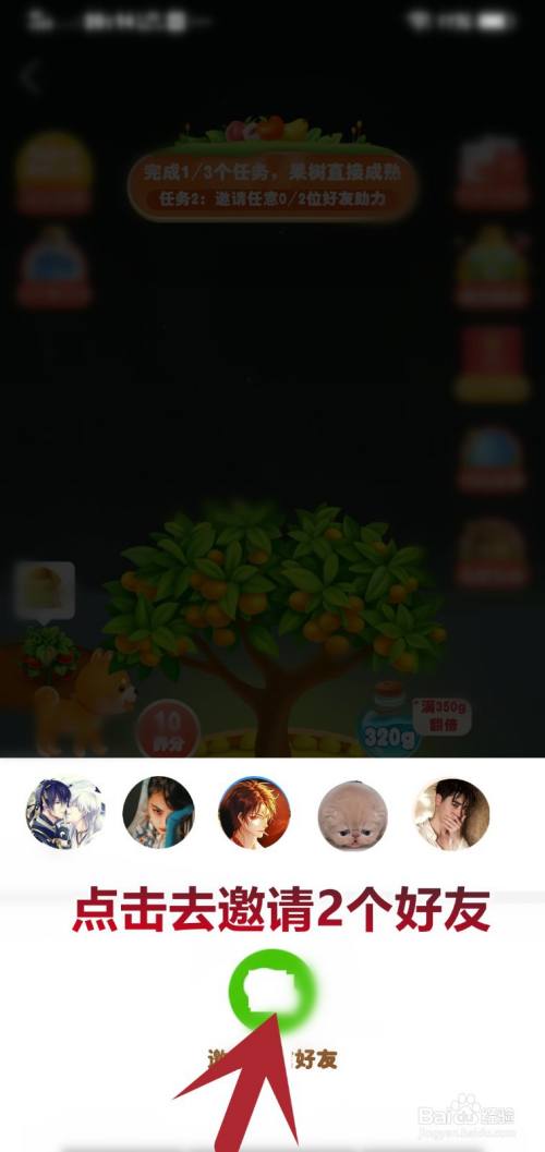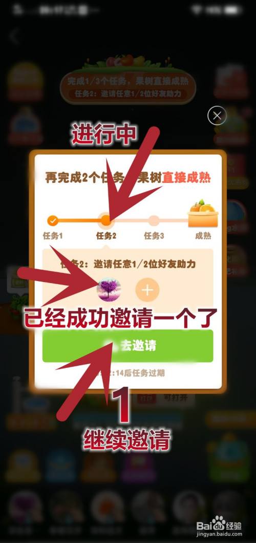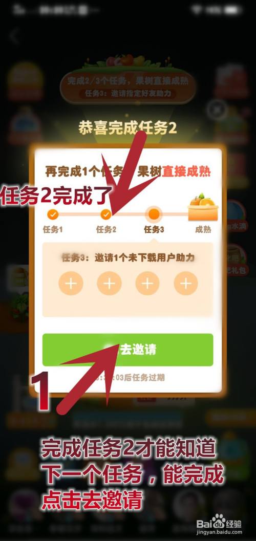 完成任务2才能知道下一个任务内容,能完成点击去邀请,所有任务都完成果树就成熟,没有规定时间里完成最后一个任务就失败没有这个果实直接成熟奖励。
