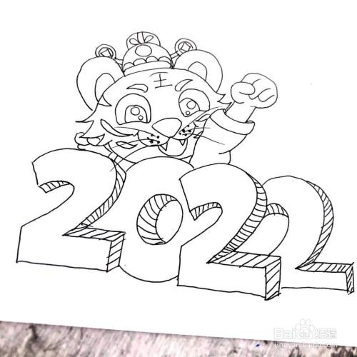 继续用黑色勾线笔将立体字体的2022年小老虎加油的装饰形象进行绘画,并粘贴在首页留出的空白卡纸上。