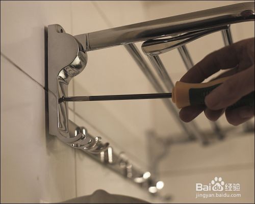在1.8米高度安装好了双层浴巾架以后,接下来在下面距离地面1.5米高度位置安装毛巾挂架,和前面一样,墙面开孔后螺丝拧紧进行安装。