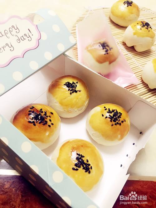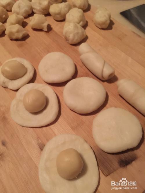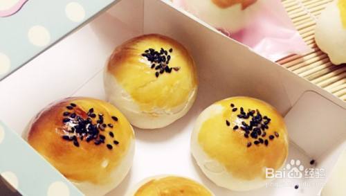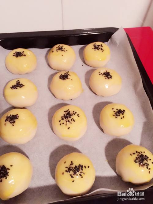 把长舌状的面皮立起来,摁圆,擀开,把绿豆馅搓圆放进擀圆的面皮里,像包小包子一样包起,收口向下(尽量搓的圆一点,为了好看),用刷子蘸上蛋黄液涂抹在那个绿豆酥的顶面,并撒上黑芝麻。