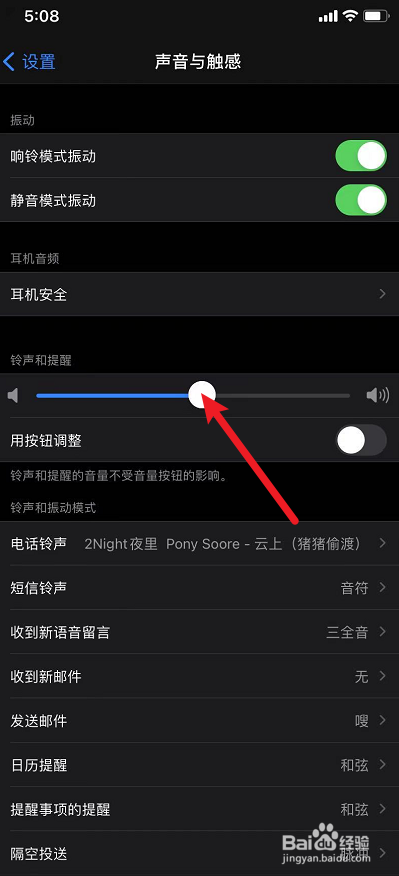 打开声音与触感后,滑动铃声和提醒下面的按钮。