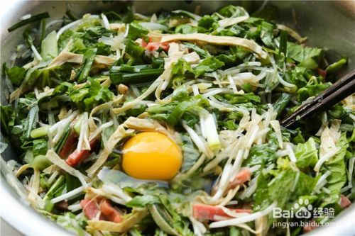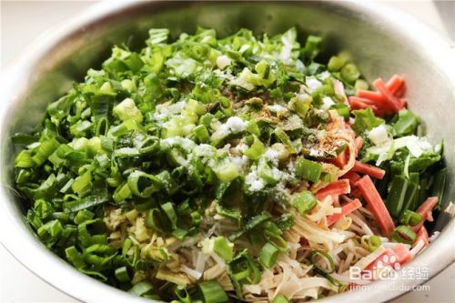 蔬菜处理一下,不需要切的太碎,切段即可。粉条用开水烫一下,切碎,豆腐皮泡软切碎,午餐肉切成丝。香菜和葱姜都切末待用。全部切好的食材放在料理盆里,加入调料拌匀。