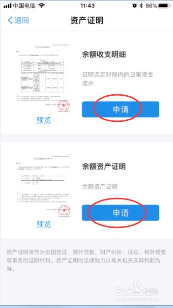 4、有【余额收支明细】和【余额资产证明】,要开哪种就点击对应的申请